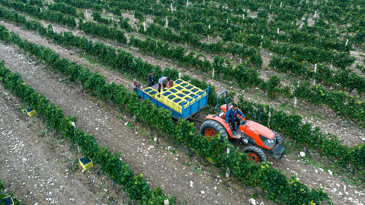工人在寧夏沃爾豐釀酒葡萄種植基地轉(zhuǎn)運(yùn)采摘下的釀酒葡萄(2024年9月19日攝,無(wú)人機(jī)照片)。