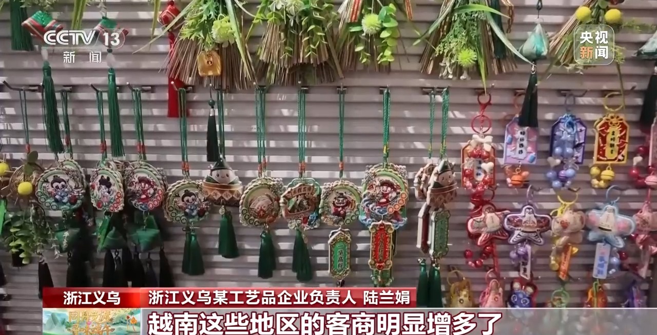 浙江義烏某工藝品企業(yè)負(fù)責(zé)人 陸蘭娟:以前香囊的消費(fèi)群體以國(guó)內(nèi)為主,這兩年,越來越多的外國(guó)客商來咨詢。前年賣出了15萬(wàn)個(gè)左右,去年訂單翻了一番,有30萬(wàn)個(gè)。那今年的訂單也明顯超過了過去,尤其是新加坡、馬來西亞、越南這些地區(qū)的客商明顯增多。