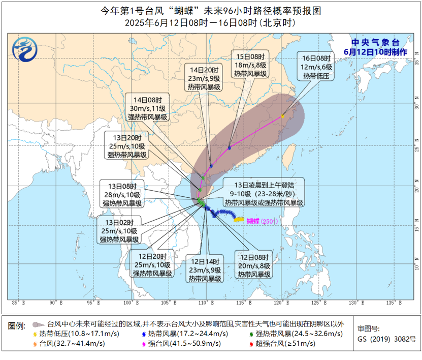 根據(jù)預(yù)報路徑,“蝴蝶”在海南島沿海首次登陸后,可能于14日白天在廣東西部到廣西沿海再次登陸,屆時強度仍將維持在強熱帶風(fēng)暴級,登陸后轉(zhuǎn)向東北方向移動,強度逐漸減弱。