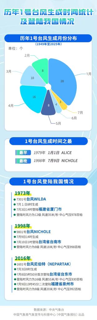氣象上通常將當(dāng)年西北太平洋及南海生成的首個編號臺風(fēng)稱為“初臺”。統(tǒng)計顯示,每年1號臺風(fēng)生成的時間分散在1月至7月。1979年的“初臺”在元旦當(dāng)天就生成了,而1998年的“初臺”則直到7月9日才出現(xiàn)。常年平均“初臺”生成時間為3月25日,從這個角度看,今年第一個臺風(fēng)有點姍姍來遲了。