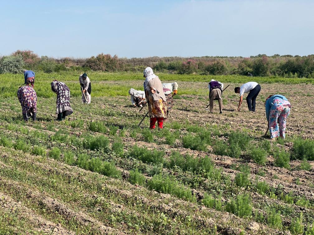 6月3日,位于烏茲別克斯坦穆伊納克鎮(zhèn)的咸海國際創(chuàng)新中心的試驗(yàn)示范園區(qū)內(nèi),當(dāng)?shù)剞r(nóng)戶在與中國科學(xué)院新疆生態(tài)與地理研究所合作共建的“光伏+生態(tài)”鹽生植物園里勞作。(受訪者供圖)