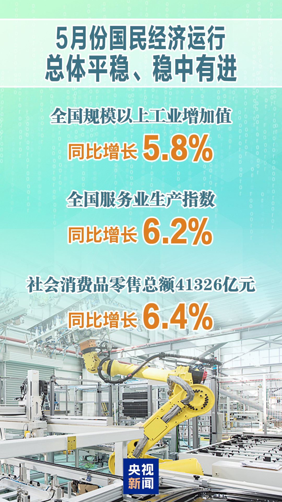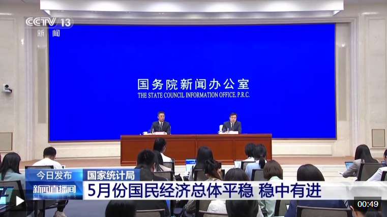 今天(6月16日)上午10時,國務(wù)院新聞辦召開新聞發(fā)布會,國家統(tǒng)計局介紹了5月份國民經(jīng)濟運行情況。相關(guān)負責人表示,隨著我國加緊實施更加積極有為的宏觀政策,5月份,國民經(jīng)濟頂住壓力平穩(wěn)運行,生產(chǎn)需求穩(wěn)定增長,就業(yè)形勢總體穩(wěn)定,新動能成長壯大,高質(zhì)量發(fā)展向優(yōu)向新。