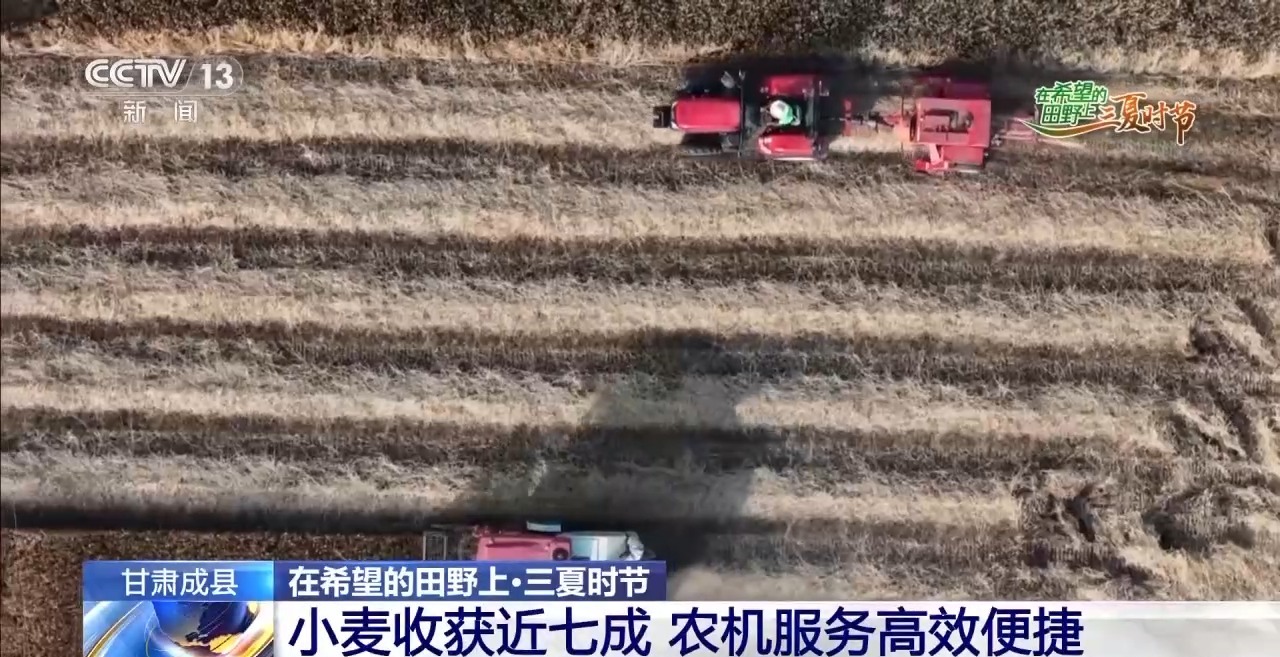 甘肅省隴南市成縣蘇元鎮(zhèn)水壩村的全國(guó)綠色食品原料標(biāo)準(zhǔn)化生產(chǎn)基地內(nèi),1600畝小麥近日進(jìn)入收獲高峰。農(nóng)戶自清晨6時(shí)起搶收小麥。該區(qū)域一片約20畝的麥田,過去需20人勞作5天完成收割、脫粒至晾曬全過程;如今1臺(tái)機(jī)械作業(yè)3小時(shí)即可完成收割與脫粒,效率顯著提升。
