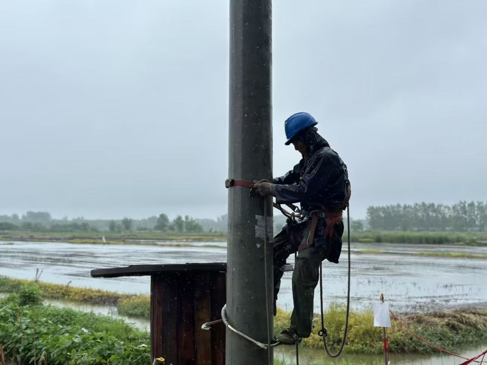 21日上午,暴雨如注,湖北荊州石首市大垸鎮(zhèn)北碾村的田野在雨幕中愈發(fā)朦朧。“雨勢(shì)還在加大,必須趕在積水漫過(guò)田埂前完成架線!”在北碾村東河頭八組,電工祁劍的呼喊聲穿透雨幕。