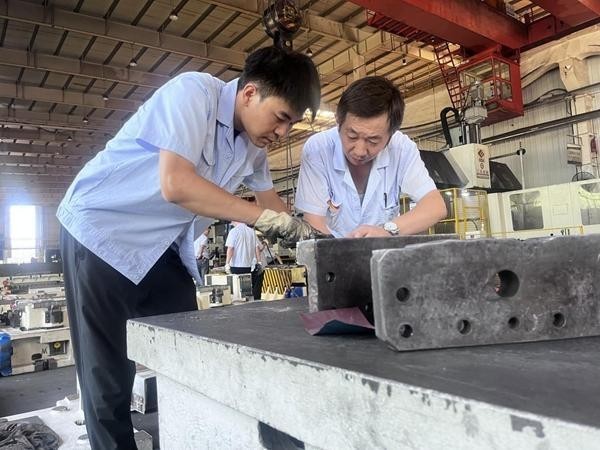 黨金鑫(左一)與師傅正在對汽車裝備廠模具進(jìn)行修復(fù)。受訪者供圖