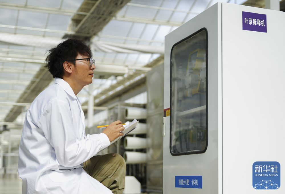 ↑ 6月25日,在新疆阿克蘇地區(qū)庫(kù)車市甬庫(kù)同心村智慧農(nóng)業(yè)植物工廠,工作人員在監(jiān)測(cè)記錄智能水肥一體機(jī)運(yùn)行情況。