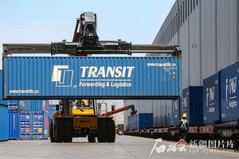 6月24日,阿拉山口站中歐(中亞)班列換裝區(qū)內(nèi)的行車在吊裝集裝箱。蔡增樂 攝