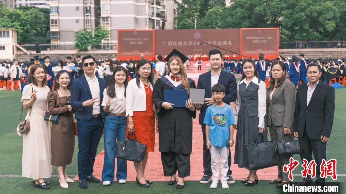 在廣西科技大學(xué)27日舉行的畢業(yè)典禮上,老撾留學(xué)生馬麗文成為全場焦點:她的父母、兄弟等十位親人跨國而來,見證這一重要時刻?!爱敿胰耸峙貂r花向我走來,我緊緊擁抱住他們,感謝他們支持我的夢想。”馬麗文說。