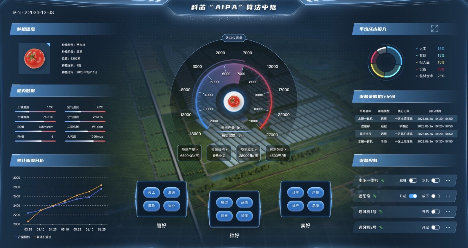 科芯自主研發(fā)的AIPA系統(tǒng),整合了多項新興技術,能夠精準描述作物的生長動態(tài),并作出生產力預測與效益評估。胡建龍形象地比喻:“這就像是給農作物配備了一位24小時在線的‘智能管家’,它能根據(jù)作物的需求,自動調整灌溉、施肥、遮陽等操作,確保作物在最佳環(huán)境中生長?!?/p>