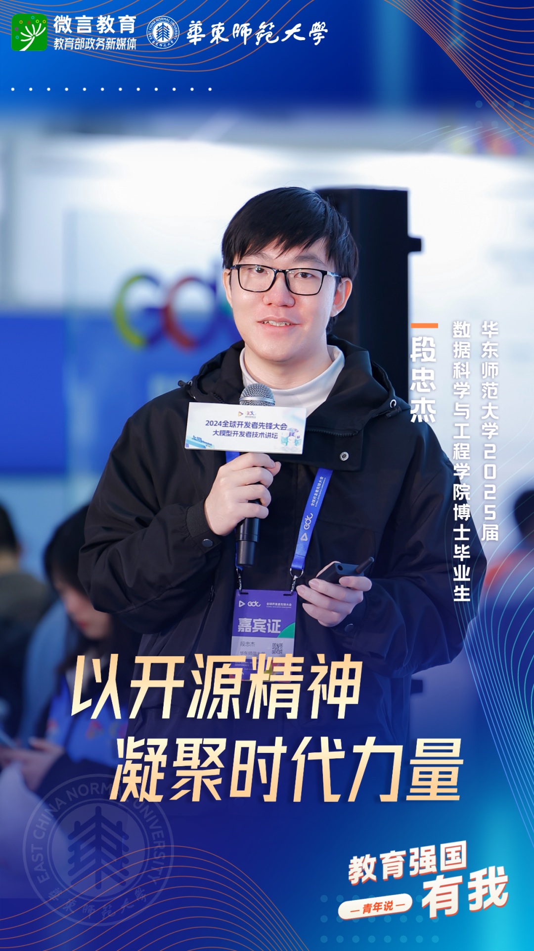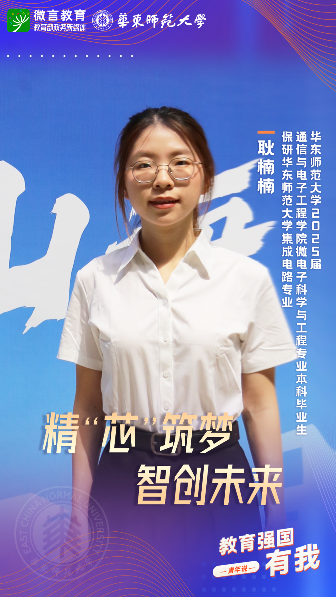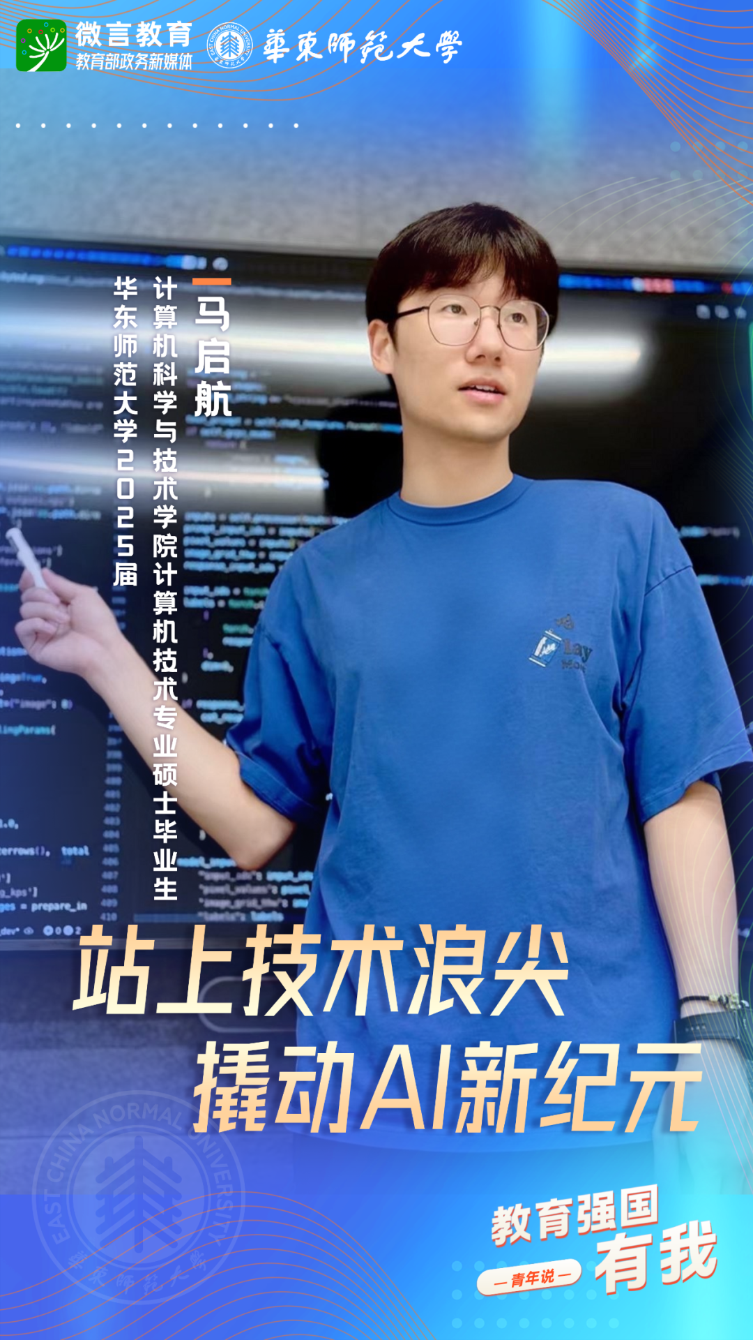 習(xí)近平總書記強調(diào),希望廣大青年堅定理想信念,厚植家國情懷,練就過硬本領(lǐng),發(fā)揚奮斗精神,到祖國和人民最需要的地方發(fā)光發(fā)熱,為中國式現(xiàn)代化建設(shè)貢獻(xiàn)青春力量。教育強國建設(shè),青年何為?教育部政務(wù)新媒體推出“教育強國,有我!”網(wǎng)絡(luò)主題宣傳活動之“青年說(報國篇)”系列,展現(xiàn)青年學(xué)子將個人理想融入國家發(fā)展的青春擔(dān)當(dāng)。今天,跟教育小微通過1個視頻和1組海報,一起來看華東師范大學(xué)學(xué)子如何“向新而行”——