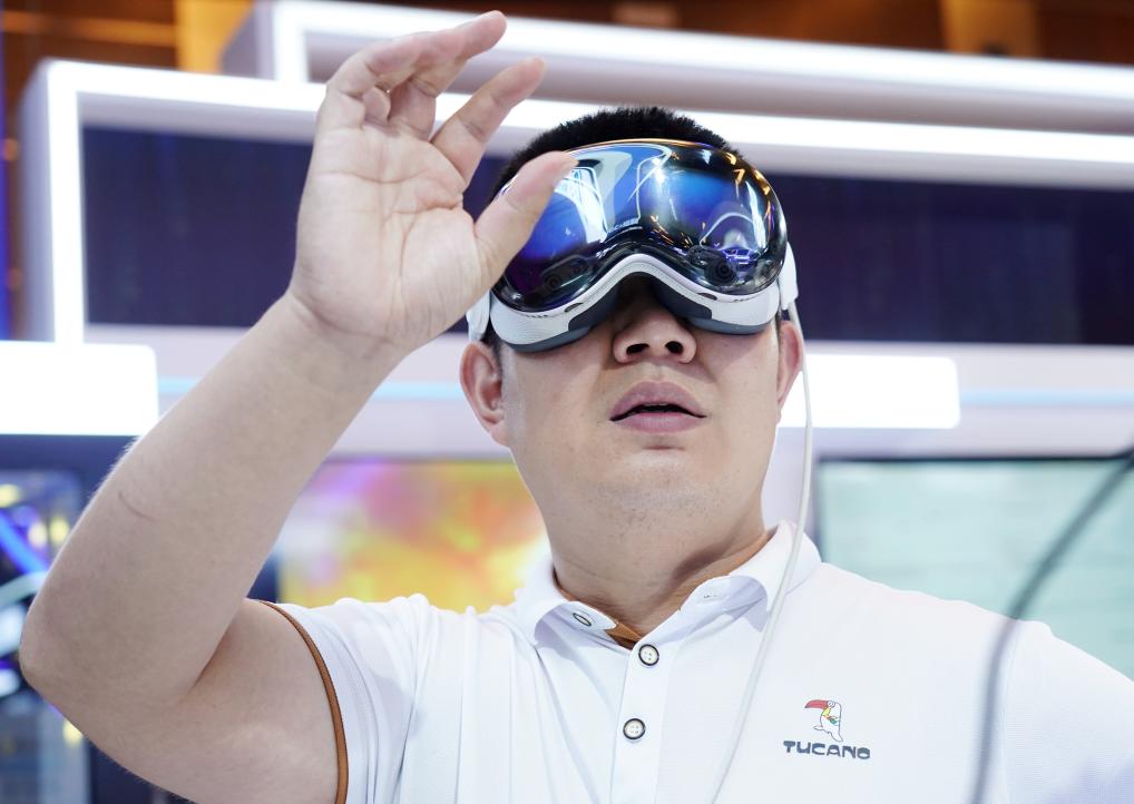 7月2日,參觀者在2025全球數(shù)字經(jīng)濟(jì)大會數(shù)字經(jīng)濟(jì)國際交流合作體驗區(qū)體驗一款MR混合現(xiàn)實設(shè)備。新華社記者 張晨霖 攝
