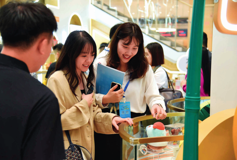港澳青年在橫琴政務(wù)服務(wù)中心的“澳品薈”橫琴展示區(qū)瀏覽澳門(mén)創(chuàng)意產(chǎn)品(2024年9月23日攝)洪澤華攝/本刊