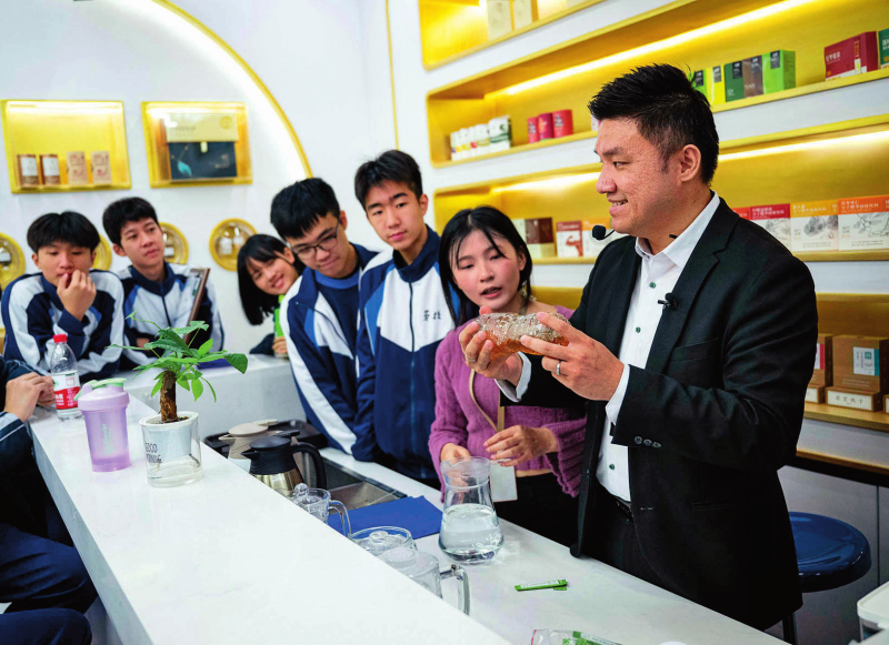 澳門(mén)居民黃滋才(右一)在位于橫琴的分子態(tài)(珠海橫琴)中醫(yī)藥健康產(chǎn)業(yè)發(fā)展有限公司的植物(現(xiàn)代中藥)分子博物館內(nèi)與澳門(mén)勞校中學(xué)的學(xué)生交流(2024年12月11日攝)新華社發(fā)(張金加攝)