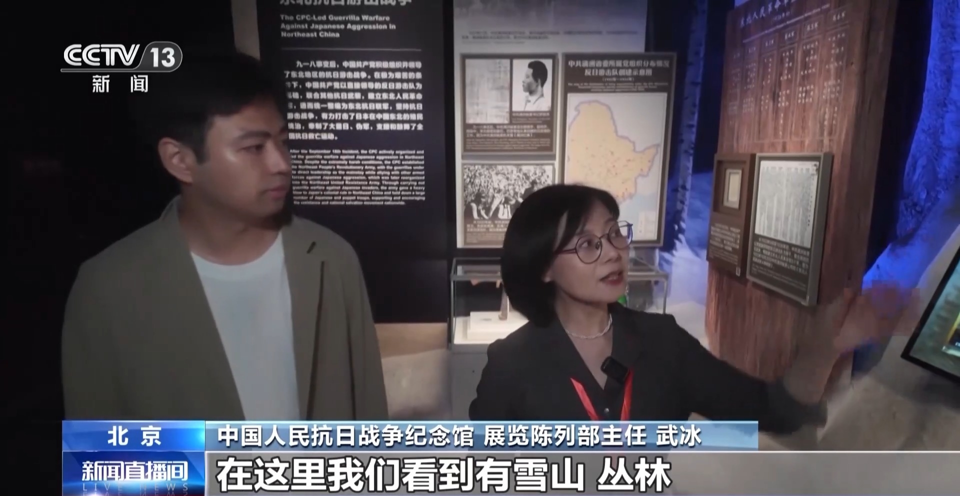 中國人民抗日戰(zhàn)爭(zhēng)紀(jì)念館 展覽陳列部主任 武冰:現(xiàn)在我們來到的這個(gè)空間就是東北抗聯(lián),在這里我們看到有雪山、叢林,在這里還增加了松樹的樹種,圖片、文物全部放置在了雪山當(dāng)中。觀眾在行進(jìn)過程當(dāng)中,會(huì)有一種破雪前行、歷史畫面慢慢地呈現(xiàn)出來的感受。像這樣的綜合性的景觀打造,在整個(gè)展覽當(dāng)中大概有十余處。