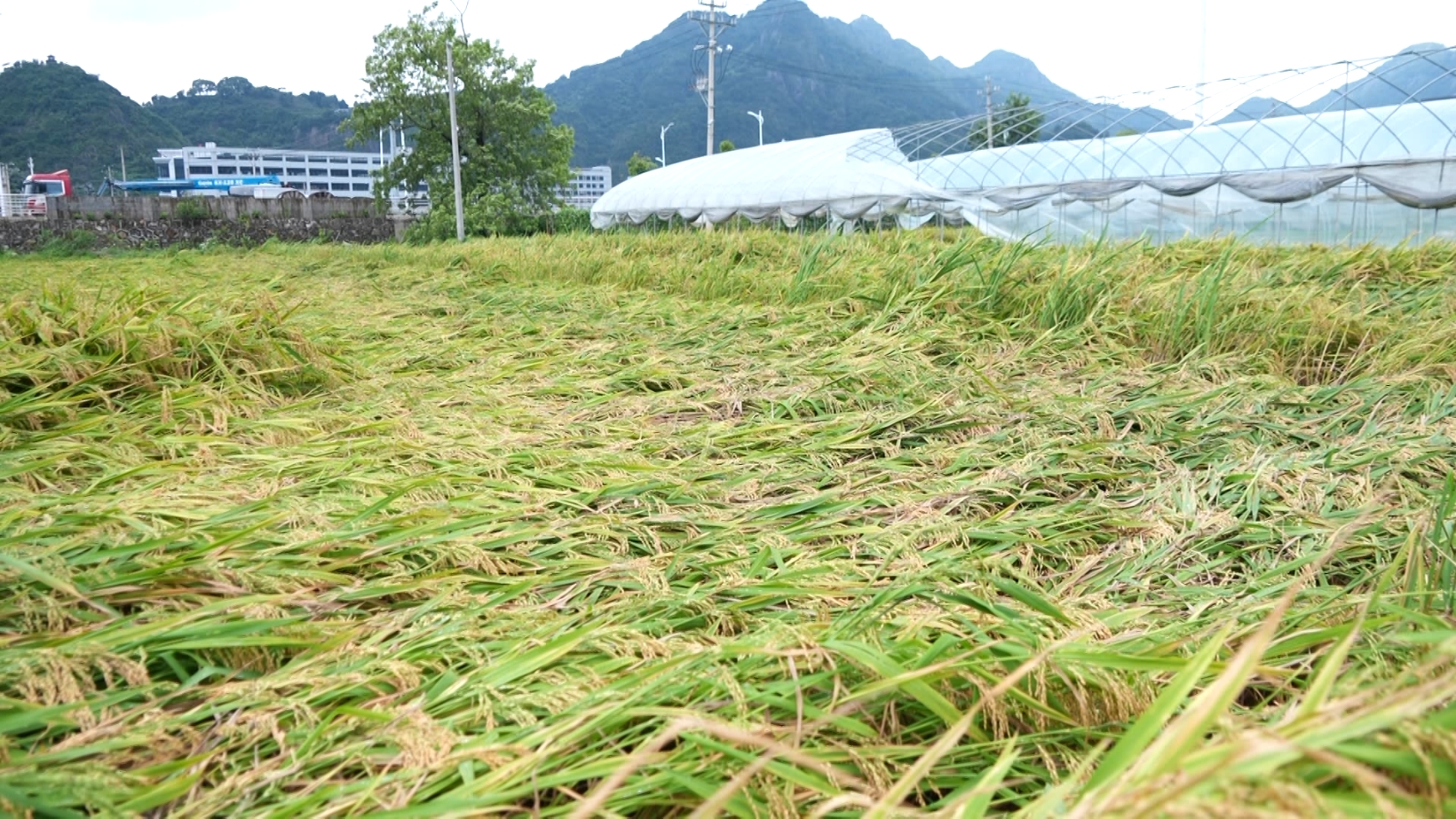 現(xiàn)場,大棚倒塌、薄膜被吹翻,成片的成熟早稻貼伏在地面。種植戶周永乾踩著泥濘,忙不迭給稻田排水,滿臉焦急?!敖衲觊L勢比前幾年都好,平均畝產一千斤以上,開始都高興的很,沒想到快收割的時候刮臺風。我們一夜都沒睡,在家里睡不著,現(xiàn)在只剩下山邊的四十來畝稻子,其他的都倒平了?!?/p>