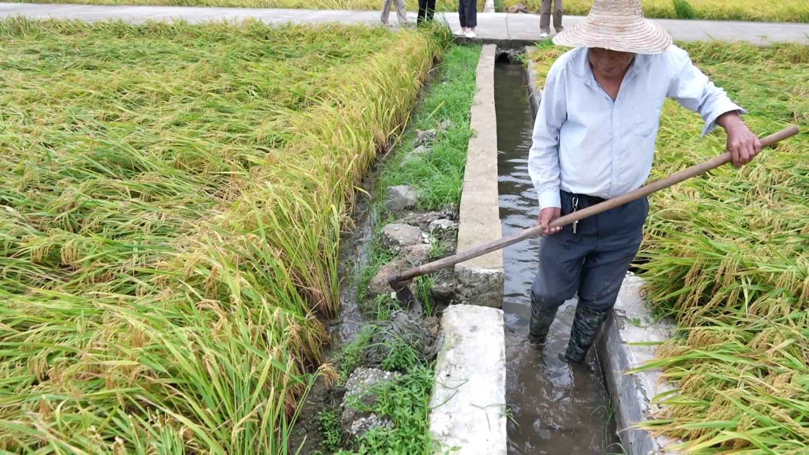 農技專家楊煥清來到現(xiàn)場指導農戶搶收,“它倒平后很容易會發(fā)芽,稻谷發(fā)芽以后就沒有價值了。現(xiàn)在主要就是開溝排水,一有晴天馬上搶收。”