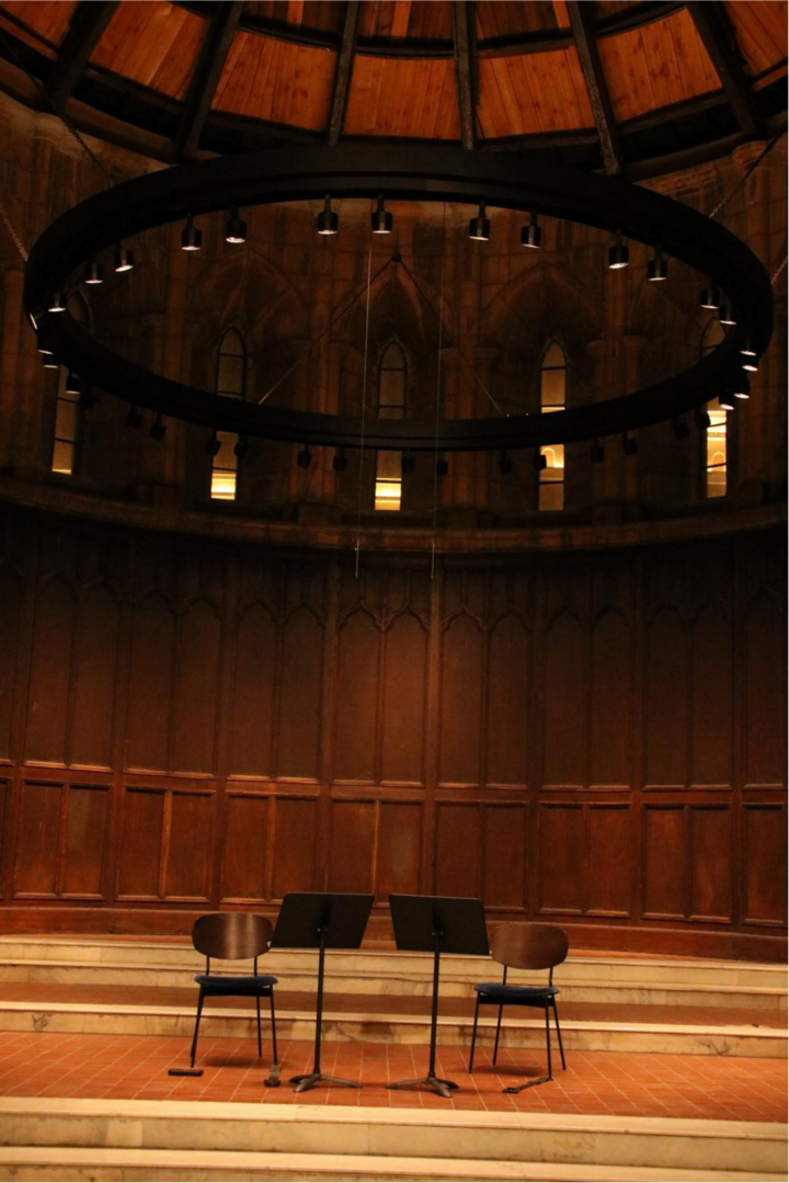 在原來祭臺的中間,現在改造為演講、演奏的環(huán)形中心臺。上方是一個中央環(huán)形燈,在沒亮燈之前就像一條烏黑色的緞帶,神秘且漂亮。