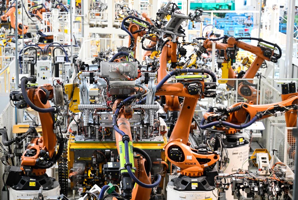 7月7日,機(jī)械臂等自動化生產(chǎn)設(shè)備在天津經(jīng)濟(jì)技術(shù)開發(fā)區(qū)一汽-大眾華北基地焊裝車間作業(yè)。新華社記者趙子碩 攝