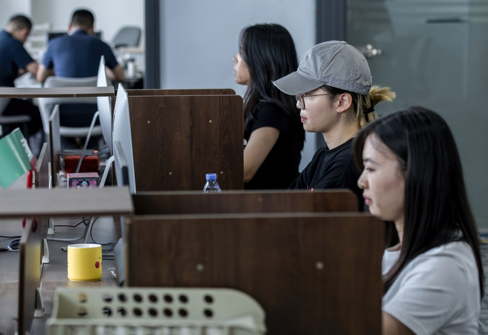 來自華僑大學(xué)的臺灣學(xué)生(右二)在廈門“臺青創(chuàng)客家”里實(shí)習(xí)(2024年6月14日攝)。新華社記者 魏培全 攝