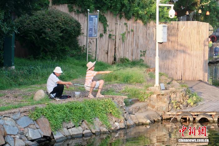 7月19日,江西省南昌市八一公園內(nèi),釣魚愛好者持小魚竿悠哉垂釣。朱瑩 攝