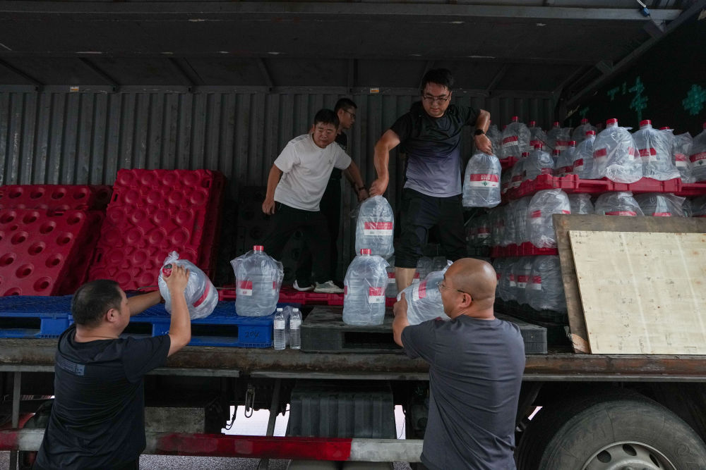 7月27日,在北京市密云區(qū)石城鎮(zhèn)中心小學安置點,工作人員在卸物資。新華社記者 鞠煥宗 攝