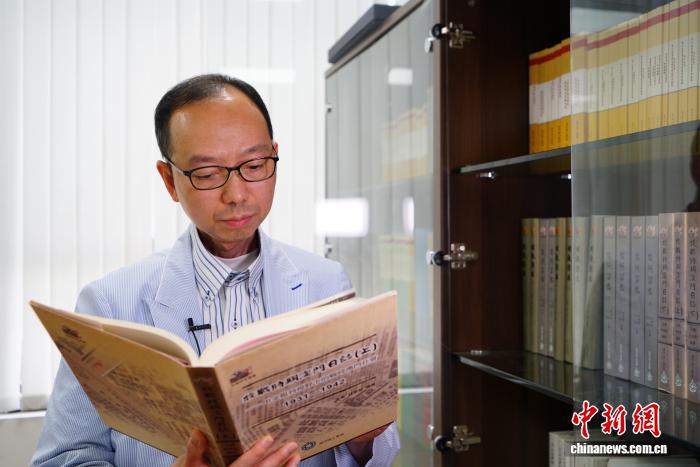 7月24日,澳門(mén)理工大學(xué)人文及社會(huì)科學(xué)學(xué)院院長(zhǎng)、澳門(mén)口述歷史協(xié)會(huì)會(huì)長(zhǎng)林發(fā)欽翻閱《抗戰(zhàn)時(shí)期澳門(mén)日志(上)》。 中新社記者 鄭嘉偉 攝