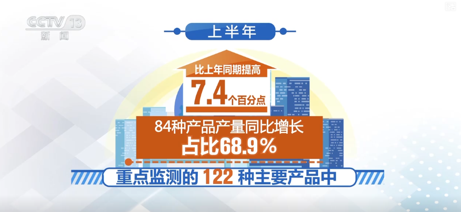 上半年,重點監(jiān)測的122種主要產(chǎn)品中,84種產(chǎn)品產(chǎn)量同比增長,占比68.9%,比上年同期提高7.4個百分點。