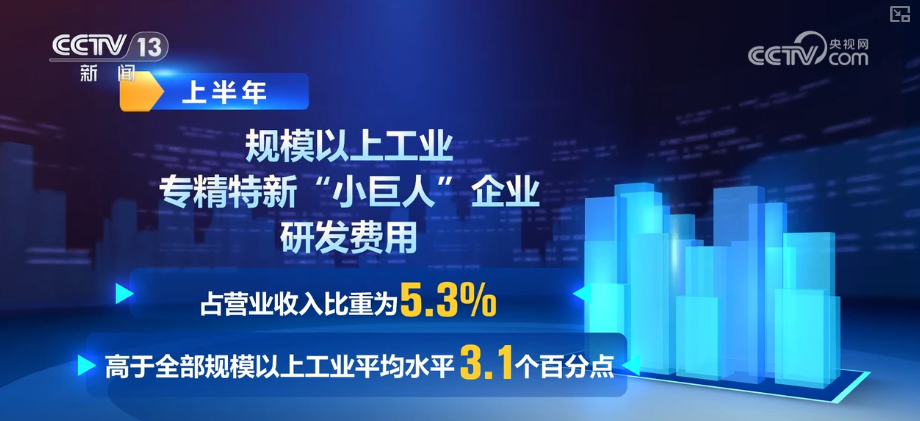 此外,中小企業(yè)創(chuàng)新能力不斷提高。上半年,規(guī)模以上工業(yè)專精特新“小巨人”企業(yè)研發(fā)費用占營業(yè)收入比重為5.3%,高于全部規(guī)模以上工業(yè)平均水平3.1個百分點,發(fā)展新質(zhì)生產(chǎn)力作用逐漸顯現(xiàn)。