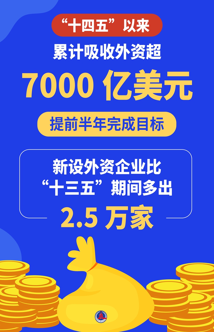 復(fù)雜嚴(yán)峻的國際經(jīng)貿(mào)環(huán)境下,我國吸引外資交出亮眼答卷——“十四五”以來,累計吸收外資超7000億美元,提前半年完成目標(biāo),新設(shè)外資企業(yè)比“十三五”期間多出2.5萬家。