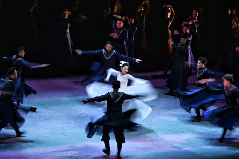 新疆木卡姆藝術(shù)集歌、舞、樂于一體。這部舞劇高潮時刻,盛大的婚禮歌頌著愛情,彈撥爾、熱瓦普等樂器依次奏響,刀郎木卡姆、哈密木卡姆等輪番上演。演員舞姿或剛勁有力,或熱鬧歡愉,帶領(lǐng)觀眾進(jìn)入歡樂的海洋。