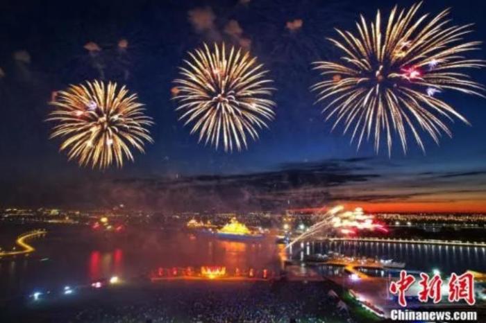7月5日晚,“夜上津門·焰遇航母”大型沉浸式夏日音樂焰火秀在天津泰達(dá)航母主題公園上演。本次焰火秀以“煙花星球”為主題,吸引了許多市民和游客沉浸式體驗(yàn)視聽盛宴。(無人機(jī)照片)中新社記者 佟郁 攝