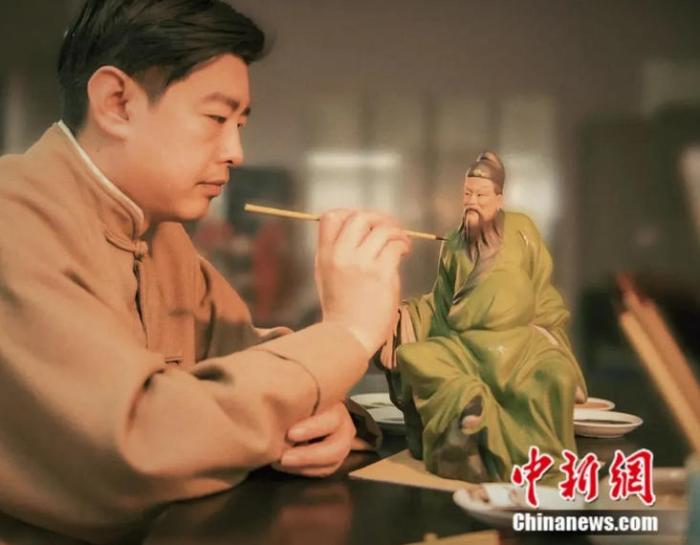 圖為“泥人張世家”第六代傳人張宇正在為泥塑繪色