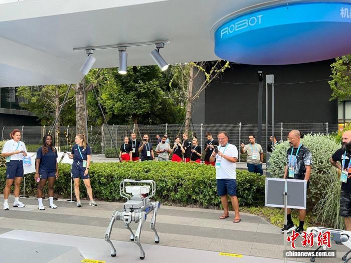 運動員圍觀成都世運村內(nèi)的機器狗。成都世運會執(zhí)委會供圖
