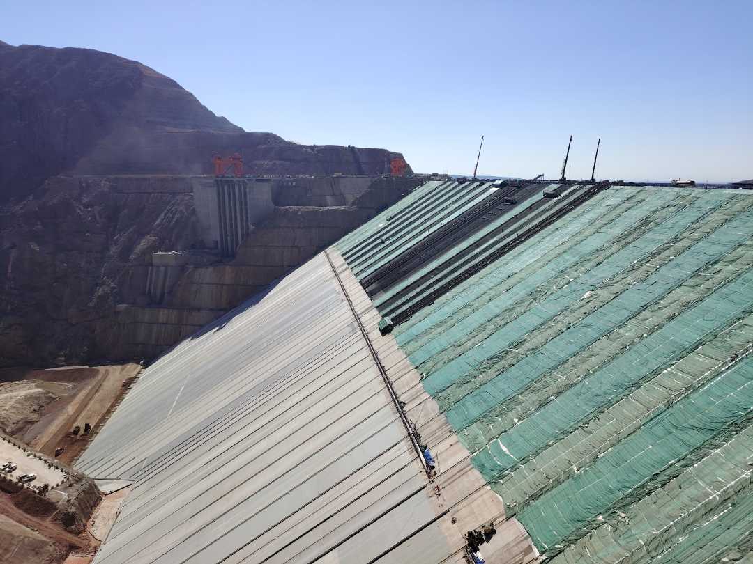 “工程最大壩高247米,創(chuàng)造了混凝土面板砂礫石壩的世界最高紀錄,并且大壩提前8個月完成了封頂,9月底就會下閘蓄水,比預計提前了1個月?!敝袊芙ǜ鹬迚渭瘓F大石峽項目公司副總工程師王峰斌介紹。