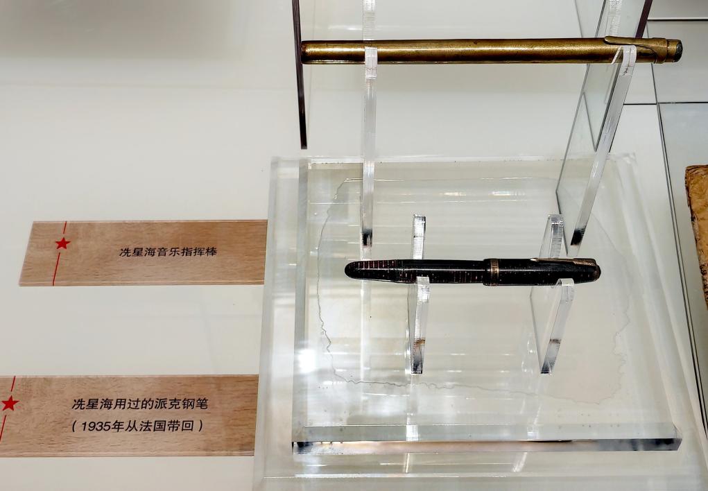 延安文藝紀(jì)念館展出的冼星海使用過(guò)的指揮棒和鋼筆。新華社記者 孫正好 攝