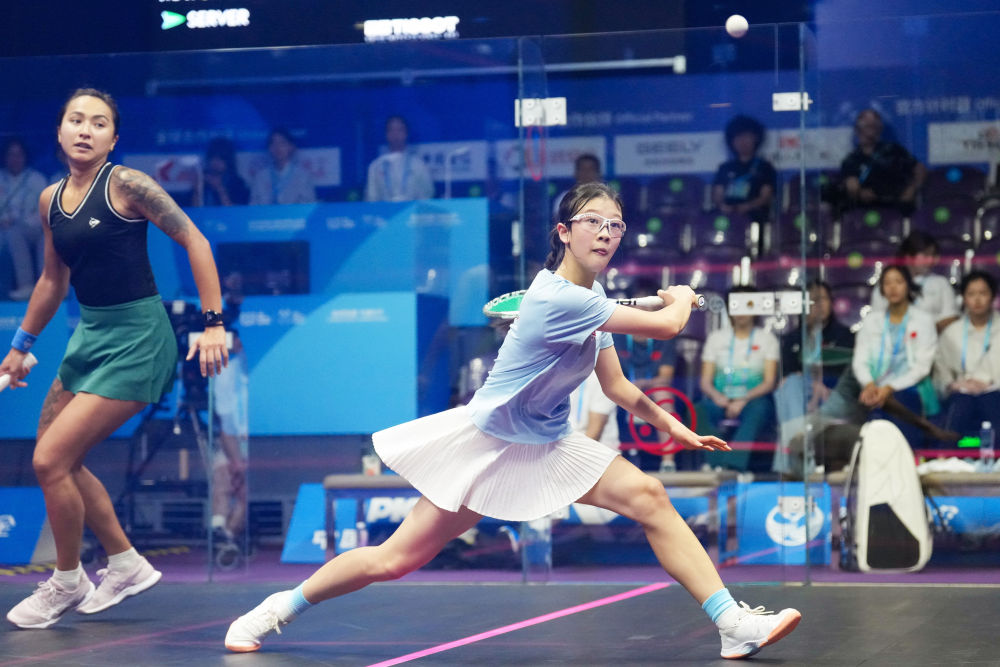 8月9日,中國(guó)選手殷子媛(右)在壁球女子單打16強(qiáng)遺材賽中擊球。新華社記者 李旭倫 攝