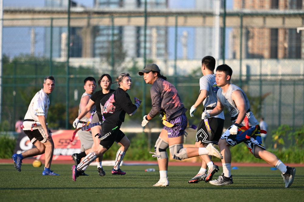 7月27日,在成都工作生活的運(yùn)動(dòng)愛(ài)好者吳慶文(左四)在腰旗橄欖球比賽中。新華社記者 胥冰潔 攝