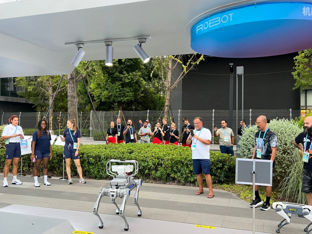 戴上AR翻譯眼鏡,葡萄牙運(yùn)動(dòng)員和德國(guó)選手開啟無障礙暢聊;美國(guó)選手一句“GoGo,帶我去熊貓商店”,智能機(jī)器狗聞聲而動(dòng);土耳其選手和智能運(yùn)動(dòng)搭子練起了球;澳大利亞姑娘欣賞著美甲機(jī)器人噴繪的熊貓圖案……