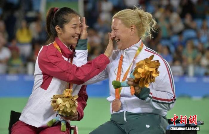 2016年9月14日,里約殘奧會(huì),輪椅擊劍女子個(gè)人花劍A級(jí)比賽冠軍獲得者中國(guó)選手榮靜正與獲得銅牌的匈牙利選手克拉伊尼亞克相互擦拭喜悅的淚水?!∷_樂馬什 攝