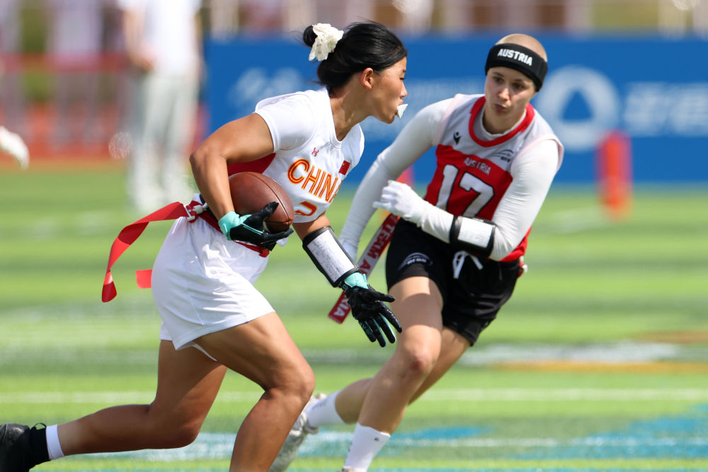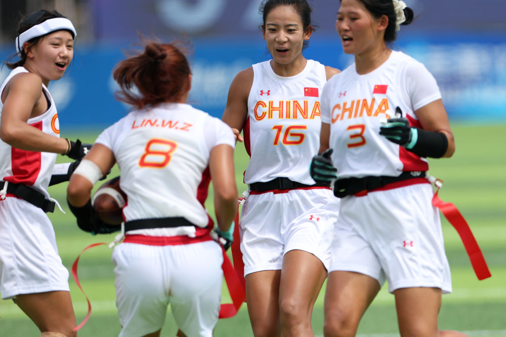 14日,腰旗橄欖球項(xiàng)目開賽。賽場上的激烈比拼與觀眾席上的“雄起”吶喊讓體育場“燃”起來。