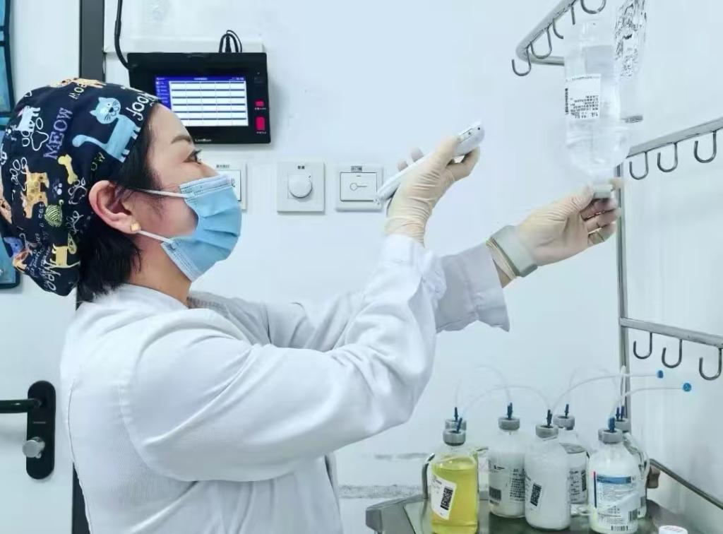 北京大學(xué)腫瘤醫(yī)院臨床試驗(yàn)病區(qū),值班護(hù)士正在核對(duì)藥物。(受訪者供圖)