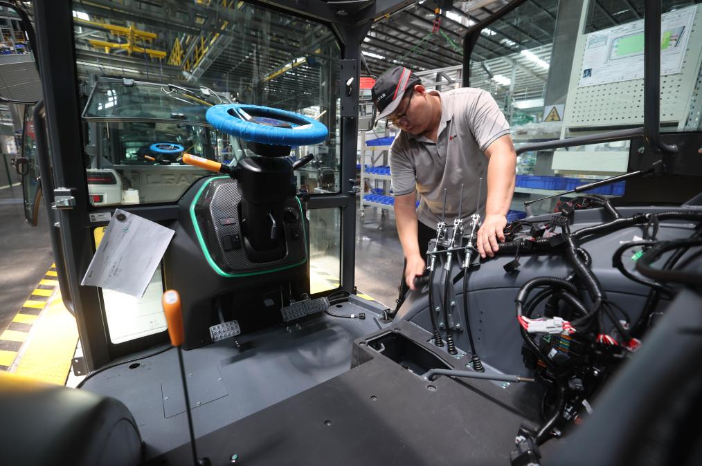 7月27日,工人在山東省臨沂市蘭山區(qū)臨工智慧農(nóng)機(jī)裝備產(chǎn)業(yè)園的流水線上組裝拖拉機(jī)。新華社發(fā)(王彥冰攝)