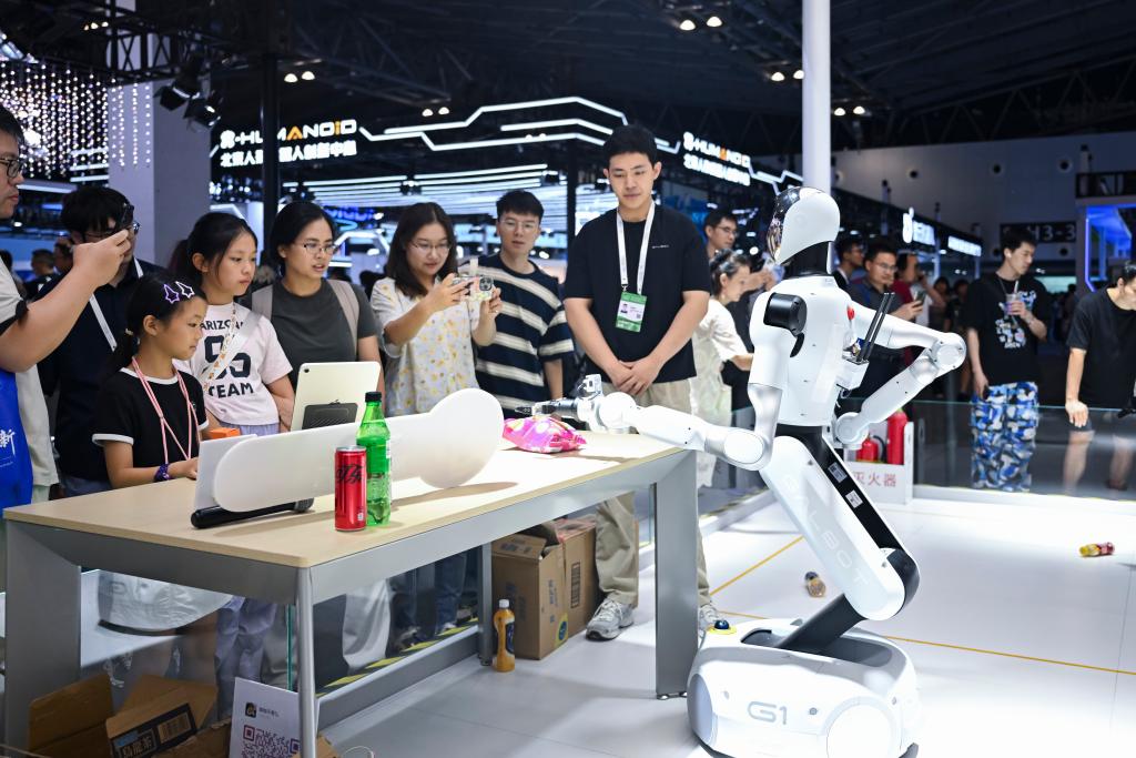 7月29日,上海2025世界人工智能大會(huì),參觀者在觀賞一款可用于零售、工業(yè)等多種場(chǎng)景的機(jī)器人。新華社記者 陳浩明 攝