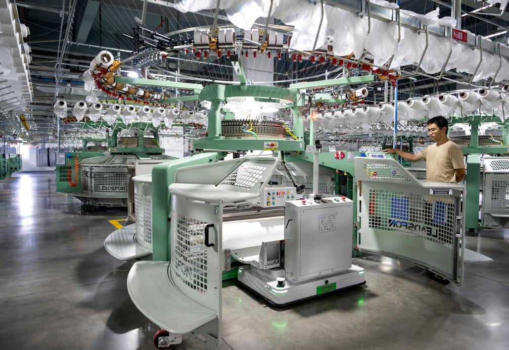 7月24日,一名工人在泉州聯(lián)興發(fā)針織織造有限公司的萊卡+5G智能數(shù)字化生產(chǎn)車間操控機(jī)器人工作。新華社記者 魏培全 攝