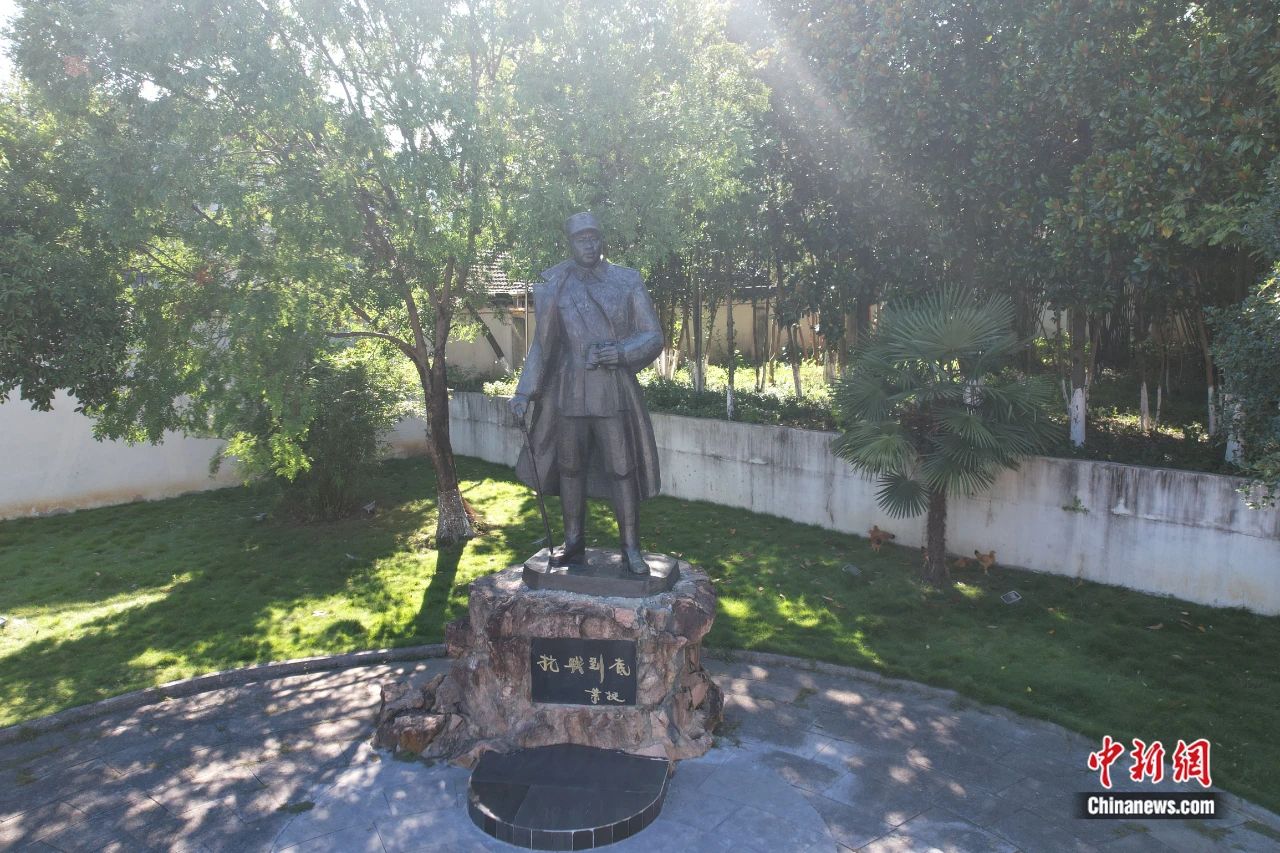 坐落在安徽涇縣云嶺鎮(zhèn)新四軍軍部舊址前的葉挺雕像。(無人機(jī)照片)張強 攝