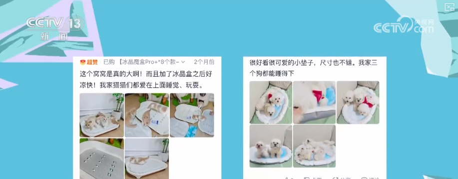 高溫還催熱了“它經(jīng)濟(jì)”。在網(wǎng)購平臺上搜索關(guān)鍵詞“寵物降溫”,寵物空調(diào)房、冰墊、冰絲圍巾、寵物專用空調(diào)等商品琳瑯滿目。一件30塊錢左右的基礎(chǔ)款寵物冰墊,月銷量輕松破萬。可調(diào)節(jié)風(fēng)速的寵物風(fēng)扇、能自動制冷的寵物窩等,同樣備受追捧。評論區(qū)的畫風(fēng)是這樣的“狗狗非常喜歡,玩得不亦樂乎”“貓咪睡覺終于踏實(shí)了”“家里的娃和毛孩子都很喜歡”。