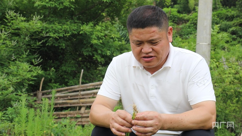 鄭春模仔細(xì)觀察梯田秧苗生長情況(央廣網(wǎng)記者 王一凡 攝)