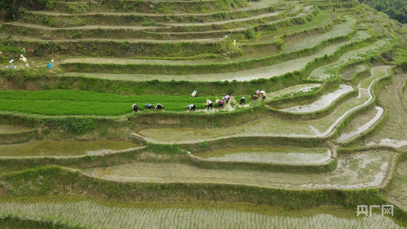 謝坪村的村民正在梯田插秧(央廣網(wǎng)發(fā) 肖江峰 攝)