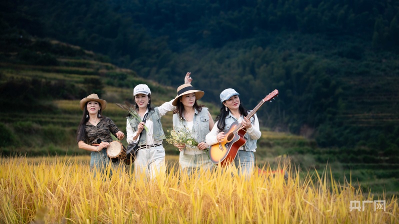 游客們手里的長槍短炮對準(zhǔn)半山腰的梯田,咔嚓聲響個(gè)不停。航拍鏡頭下,沉甸甸的谷穗隨風(fēng)搖曳。幾名熱愛音樂的游客在梯田中央彈起吉他,驚飛成群白鷺,雪白的翅膀掠過湛藍(lán)晴空。