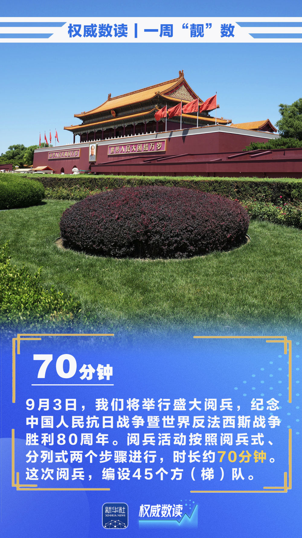 即將到來的九三閱兵活動(dòng)按照閱兵式、分列式兩個(gè)步驟進(jìn)行,時(shí)長約70分鐘;我國外貿(mào)保持穩(wěn)中有進(jìn)態(tài)勢,累計(jì)進(jìn)出口增速逐月回升,前7個(gè)月實(shí)現(xiàn)3.5%的增長;今年前7個(gè)月,我國對上海合作組織其他成員國進(jìn)出口2.11萬億元,規(guī)模創(chuàng)歷史同期新高……本周這些數(shù)據(jù),最值得關(guān)注!